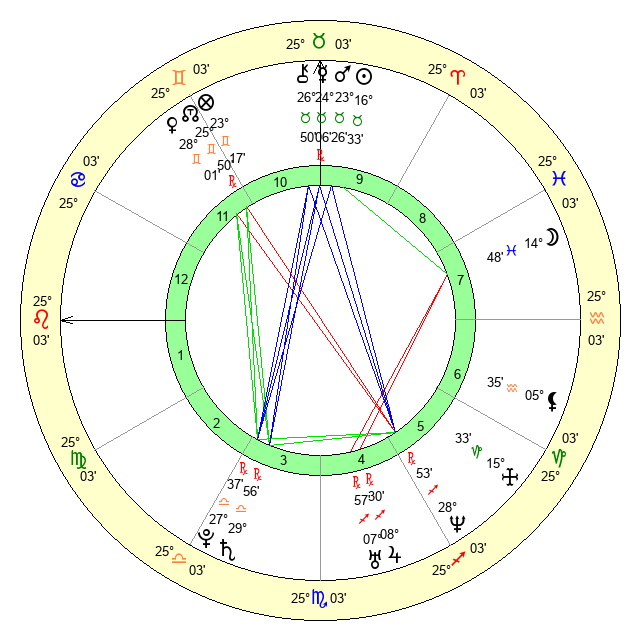| Mars | 23 Taurus 28 | 8 Leo 44 | 22 Gemini 50 |