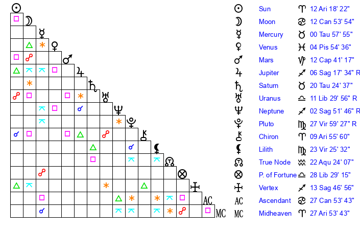 | Sun | 12 Aries 18 | 13 Aries 12 | 4 Gemini 47 |