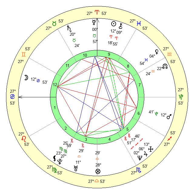 | Moon | 12 Cancer 59 | 12 Gemini 27 | 3 Cancer 7 |