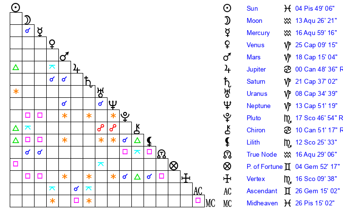 | Mercury | 16 Aquarius 59 | 17 Pisces 2 | 21 Aries 28 |