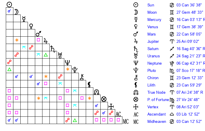 | Jupiter | 25 Aries 14 | 3 Cancer 37 | 29 Aries 20 |