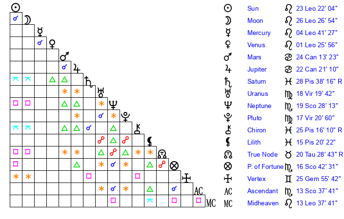 | Sun | 23 Leo 22 | 24 Leo 5 | 20 Libra 54 |
