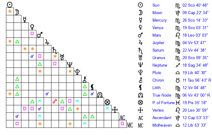 | Sun | 2 Scorpio 41 | 3 Scorpio 32 | 19 Sagittarius 3 |