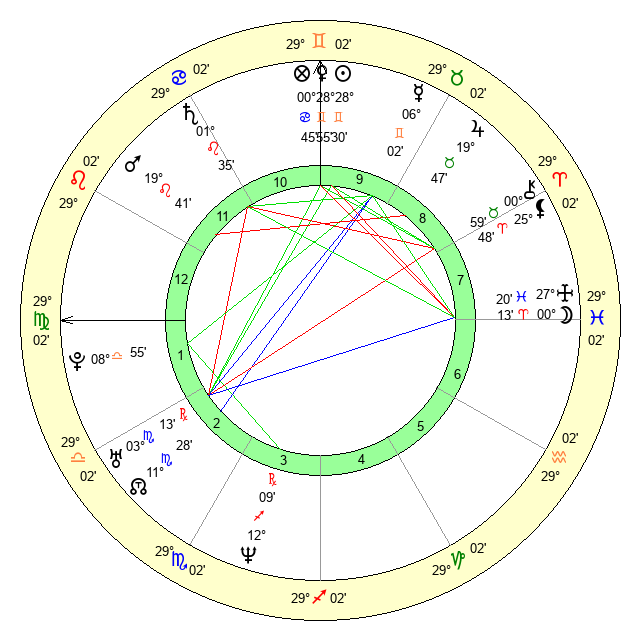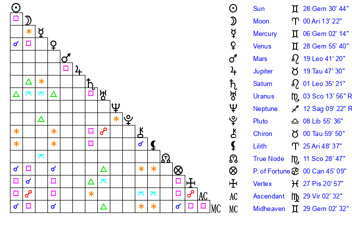 | Sun | 28 Gemini 30 | 28 Gemini 40 | 15 Leo 17 |
