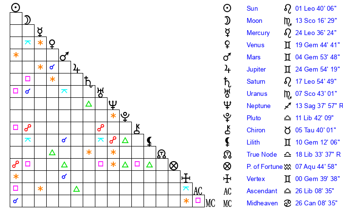 | Moon | 13 Scorpio 16 | 0 Leo 46 | 15 Leo 6 |