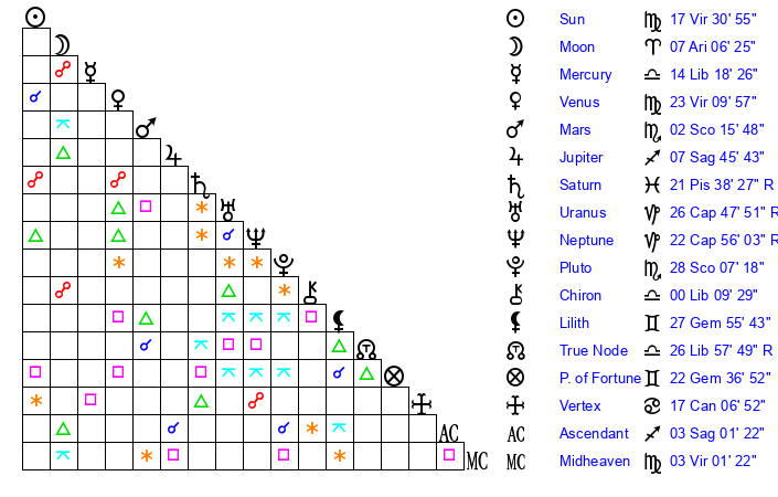 | Sun | 17 Virgo 31 | 18 Virgo 14 | 16 Libra 55 |