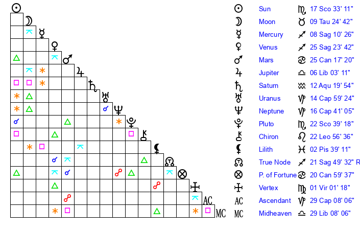 Pluto | 22 Scorpio 39 | 29 Capricorn 49 | 23 Scorpio 54 |
