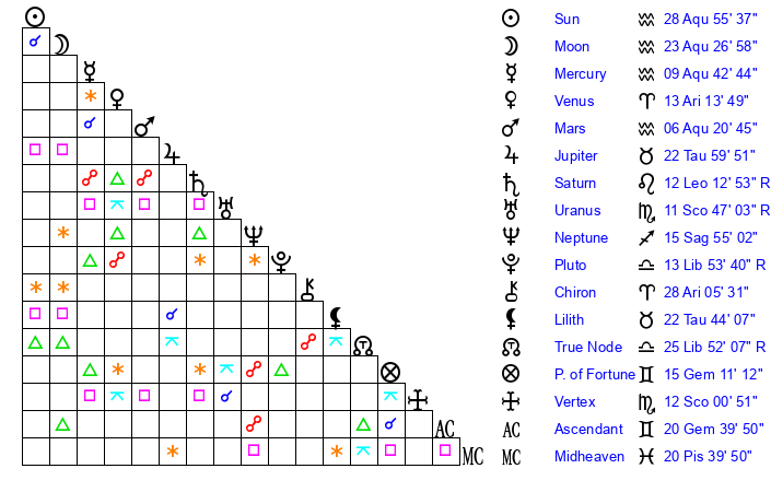 | Sun | 28 Aquarius 55 | 29 Aquarius 17 | 16 Aries 46 |