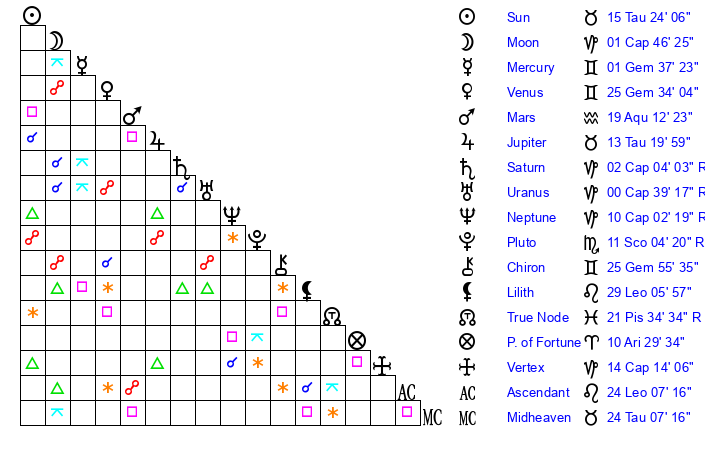| Moon | 1 Capricorn 48 | 28 Leo 42 | 18 Taurus 0 |