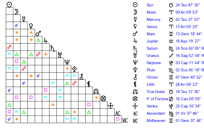 | Moon | 9 Aries 7 | 28 Sagittarius 30 | 19 Virgo 7 |