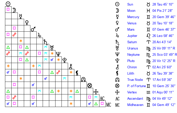 | Moon | 4 Pisces 25 | 19 Aquarius 5 | 4 Aries 21 |