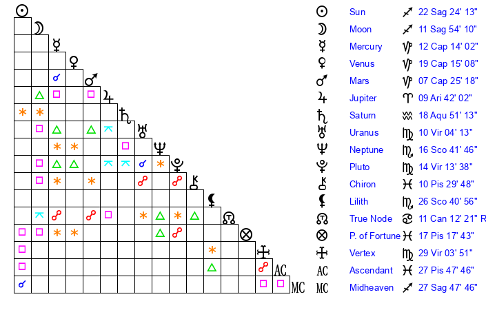 Sun | 22 Sagittarius 25 | 23 Sagittarius 37 | 24 Aquarius 27 |