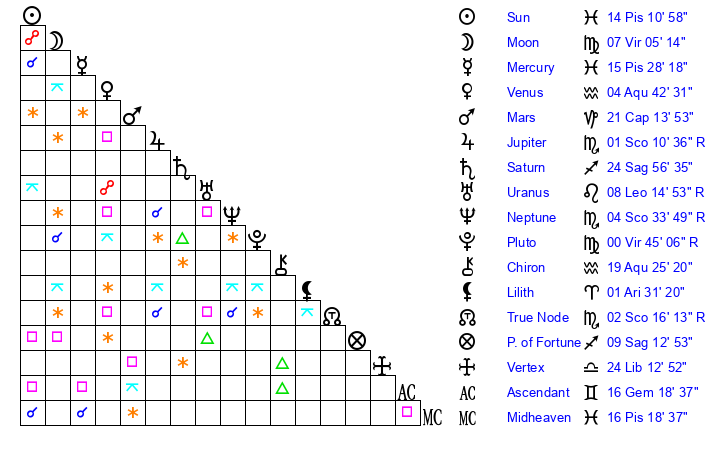 | Pluto | 0 Virgo 43 | 2 Aquarius 59 | 29 Leo 46 |