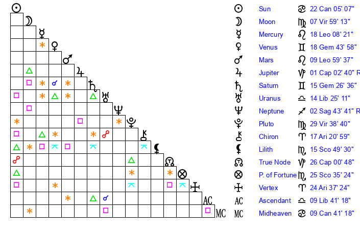 | Sun | 22 Cancer 5 | 22 Cancer 16 | 12 Virgo 58 |