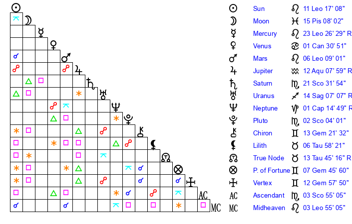 | Moon | 15 Pisces 8 | 5 Sagittarius 27 | 21 Leo 46 |