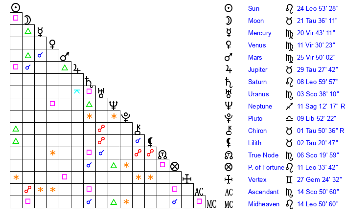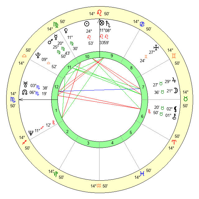 | Mercury | 20 Virgo 43 | 6 Leo 39 | 24 Virgo 52 |