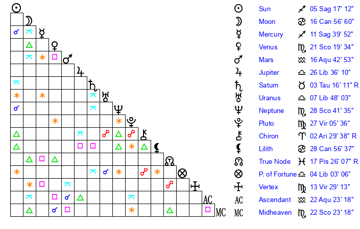 | Sun | 5 Sagittarius 17 | 5 Sagittarius 42 | 2 Aquarius 16 |