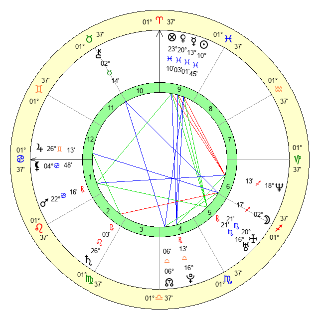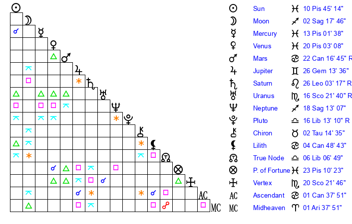 | Sun | 10 Pisces 45 | 11 Pisces 22 | 27 Aries 19 |
