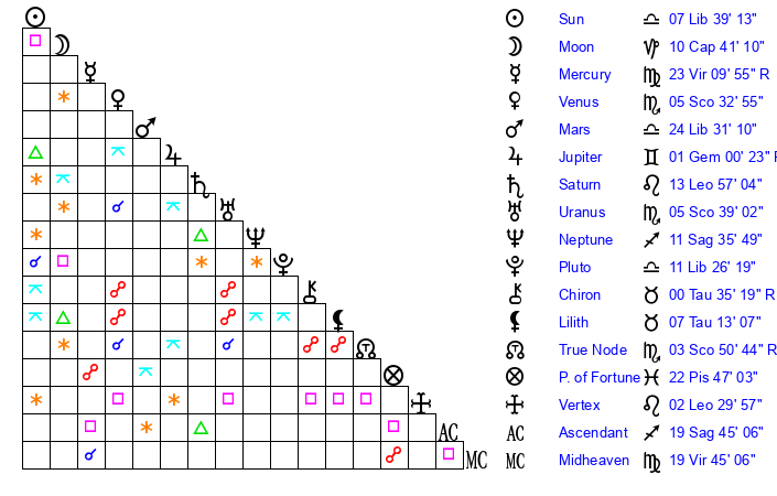 | Moon | 10 Capricorn 42 | 15 Capricorn 51 | 15 Libra 29 |