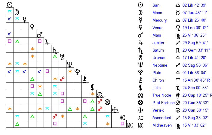 | Neptune | 2 Sagittarius 57 | 0 Aries 41 | 4 Sagittarius 37 |