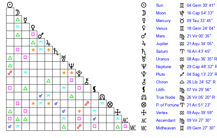| Jupiter | 21 Aquarius 36 | 26 Gemini 36 | 21 Aquarius 43 |