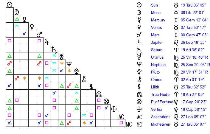 | Sun | 19 Taurus 7 | 19 Taurus 19 | 13 Cancer 42 |