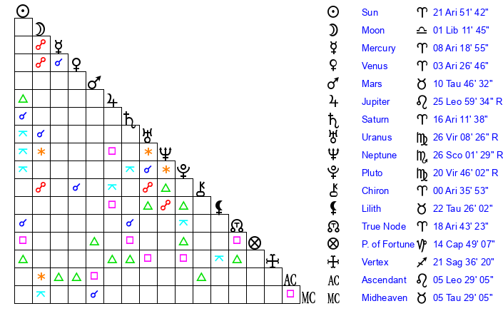 | Sun | 21 Aries 52 | 22 Aries 3 | 16 Gemini 59 |