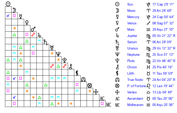 | Saturn | 6 Aries 40 | 15 Pisces 5 | 11 Aries 48 |