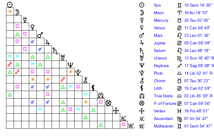 | Moon | 16 Aries 13 | 16 Leo 42 | 25 Sagittarius 52 |