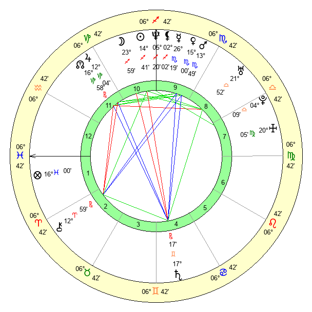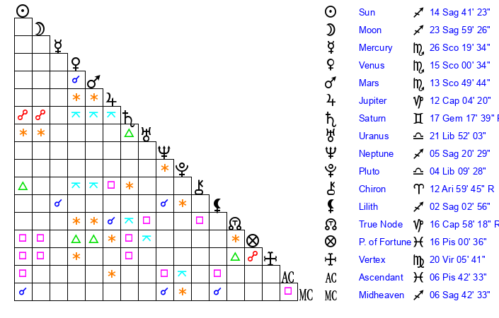 | Neptune | 5 Sagittarius 20 | 27 Pisces 7 | 6 Sagittarius 57 |