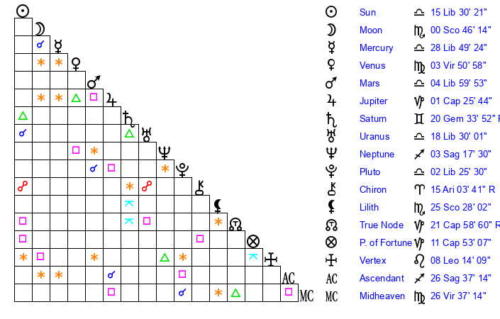 | Mercury | 28 Libra 50 | 3 Scorpio 0 | 28 Scorpio 31 |