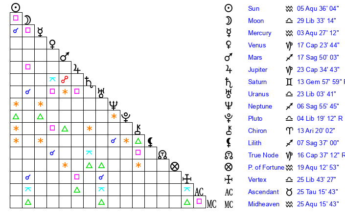 | Sun | 5 Aquarius 36 | 5 Aquarius 59 | 27 Pisces 57 |