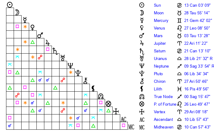 | Saturn | 21 Cancer 32 | 1 Aries 46 | 27 Cancer 51 |