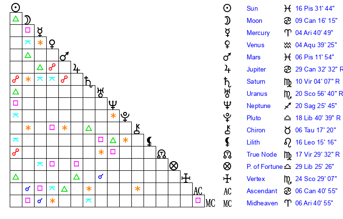 | Saturn | 10 Virgo 30 | 21 Pisces 26 | 7 Virgo 44 |