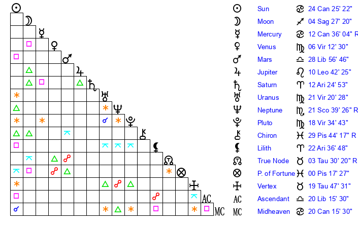 | Mercury | 12 Cancer 36 | 15 Leo 34 | 6 Libra 30 |