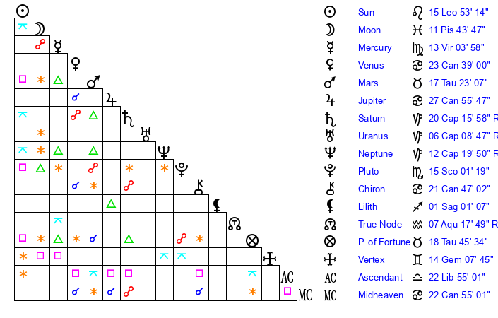 | Pluto | 15 Scorpio 1 | 2 Aquarius 14 | 15 Scorpio 37 |