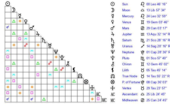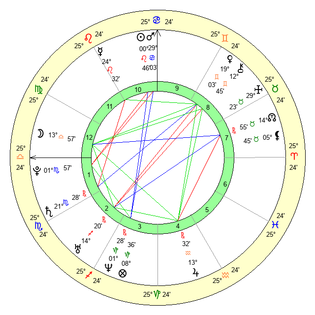 | Moon | 13 Libra 57 | 16 Cancer 48 | 5 Aries 43 |
