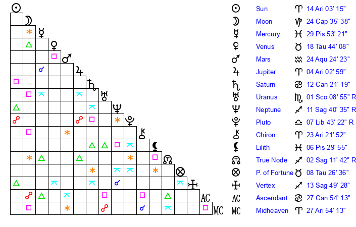 Sun | 14 Aries 3 | 14 Aries 56 | 2 Gemini 39 |