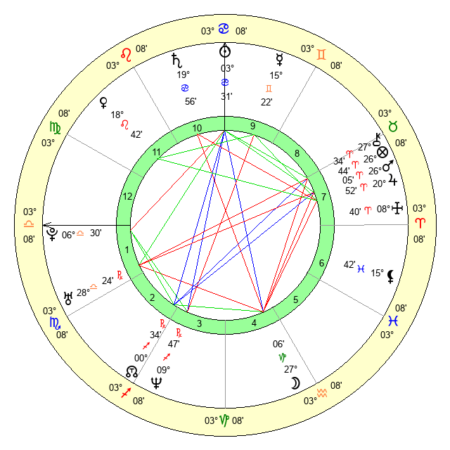 | Sun | 3 Cancer 30 | 4 Cancer 23 | 21 Leo 17 |