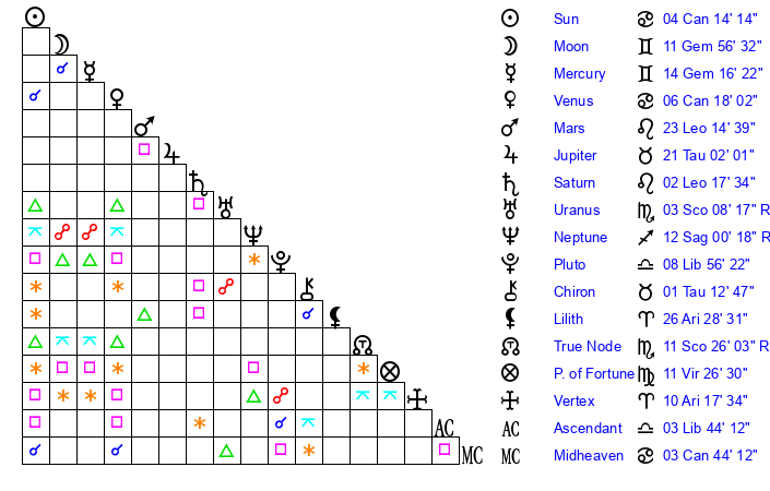 | Moon | 11 Gemini 59 | 8 Cancer 1 | 4 Aries 8 |