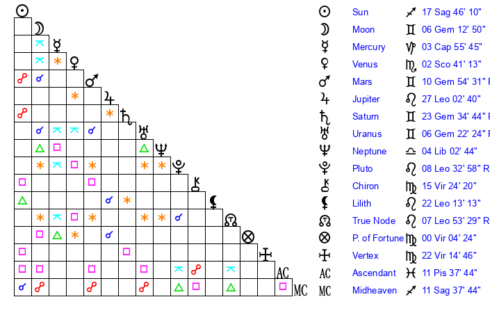 | Mars | 10 Gemini 54 | 26 Sagittarius 32 | 17 Gemini 38 |