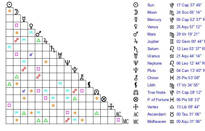 | Moon | 24 Scorpio 3 | 26 Virgo 12 | 9 Scorpio 51 |