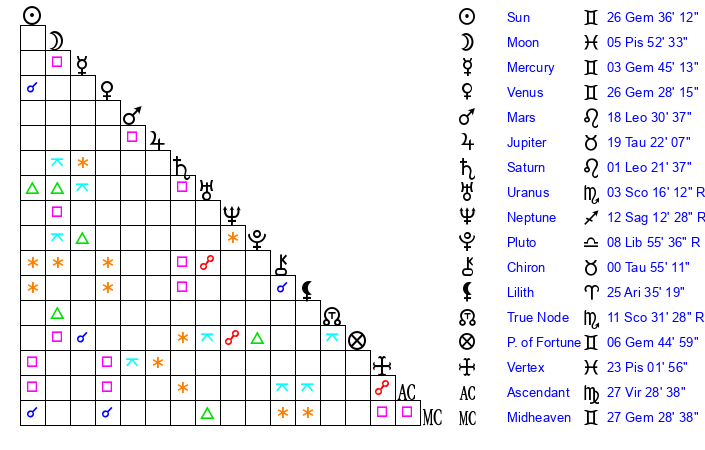 | Sun | 26 Gemini 36 | 26 Gemini 45 | 13 Leo 22 |