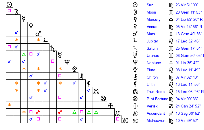 | Sun | 26 Virgo 51 | 27 Virgo 59 | 18 Sagittarius 47 |