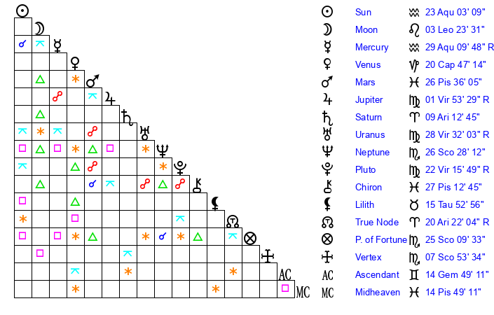 | Sun | 23 Aquarius 3 | 24 Aquarius 14 | 19 Aries 54 |