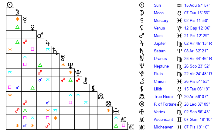 | Sun | 15 Aquarius 58 | 17 Aquarius 9 | 13 Aries 1 |