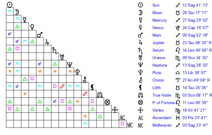 | Sun | 12 Sagittarius 41 | 13 Sagittarius 2 | 1 Aquarius 33 |