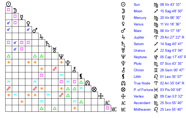 | Mercury | 20 Virgo 7 | 28 Leo 23 | 10 Scorpio 37 |