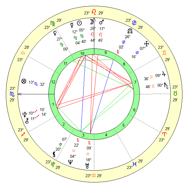 | Moon | 25 Leo 44 | 7 Scorpio 46 | 21 Cancer 34 |