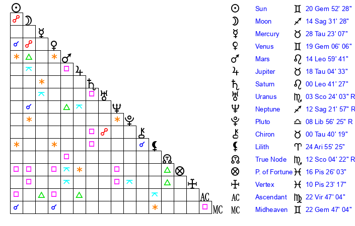 | Sun | 20 Gemini 52 | 21 Gemini 1 | 7 Leo 38 |
